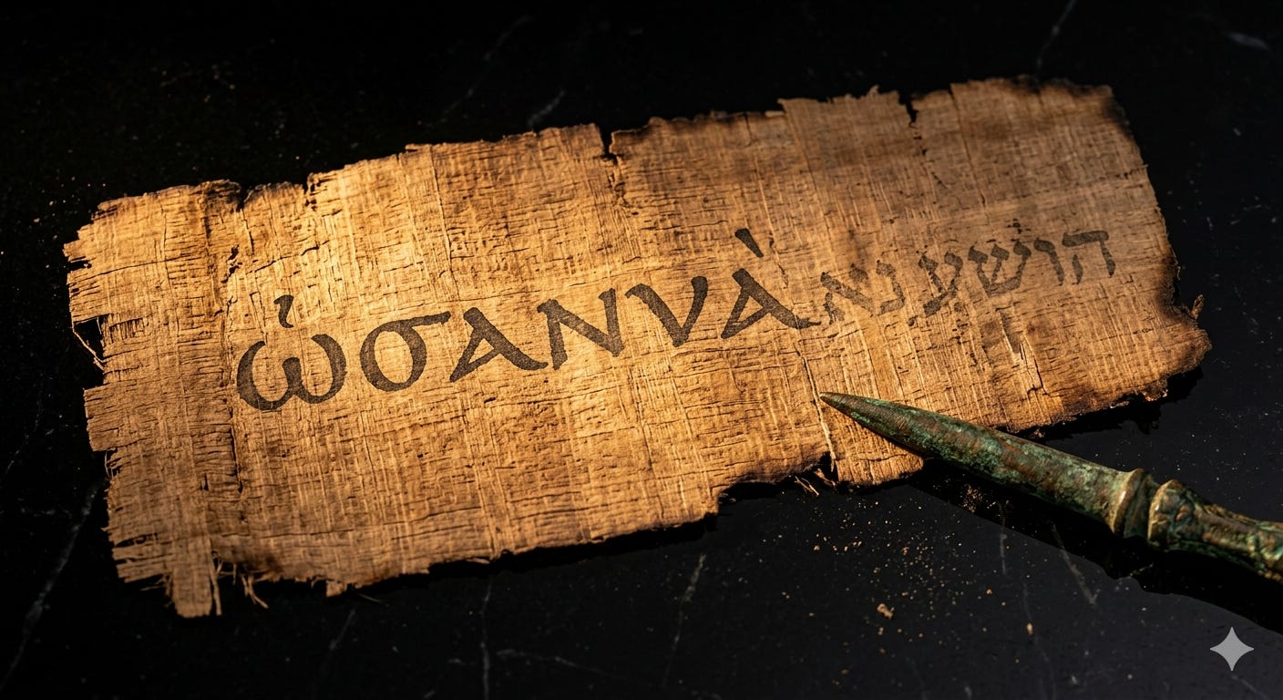 Soluția a fost transliterarea. În loc să caute un corespondent semantic în greacă, autorii Cărților Sfinte au preluat sunetul intact: ὡσαννά (hōsanná). Această decizie, aparent tehnică, are consecințe teologice profunde. Transliterarea conservă, dar și opacizează. Pentru un cititor grec din secolul I, hōsanná nu mai era o frază cu sens gramatical, era un sunet sacru, o incantație, un semn al acelui registru lingvistic distinct în care cuvintele nu mai au explicatie, ci ele invocă.