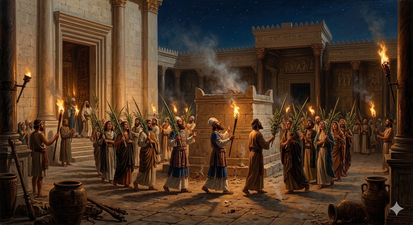 Numeroși exegeți, de la Origen în secolul al III-lea până la cercetătorii moderni ai Noului Testament (Joachim Jeremias, Raymond Brown), au subliniat că Intrarea triumfală în Ierusalim este structurată deliberat pe tiparul ritual al lui Hoshana Rabbah, ultima și cea mai intensă zi a Sărbătorii Corturilor. Ramurile agitate de mulțime, strigătul repetat de Osana Lulav, traseul procesional, toate sunt elemente ale unui ceremonial pe care ascultătorii din Ierusalim îl recunoșteau imediat. Iisus nu intră în Ierusalim în ciuda acestui tipar liturgic, ci prin el, asumând și răsturnând în același timp așteptările pe care le genera.